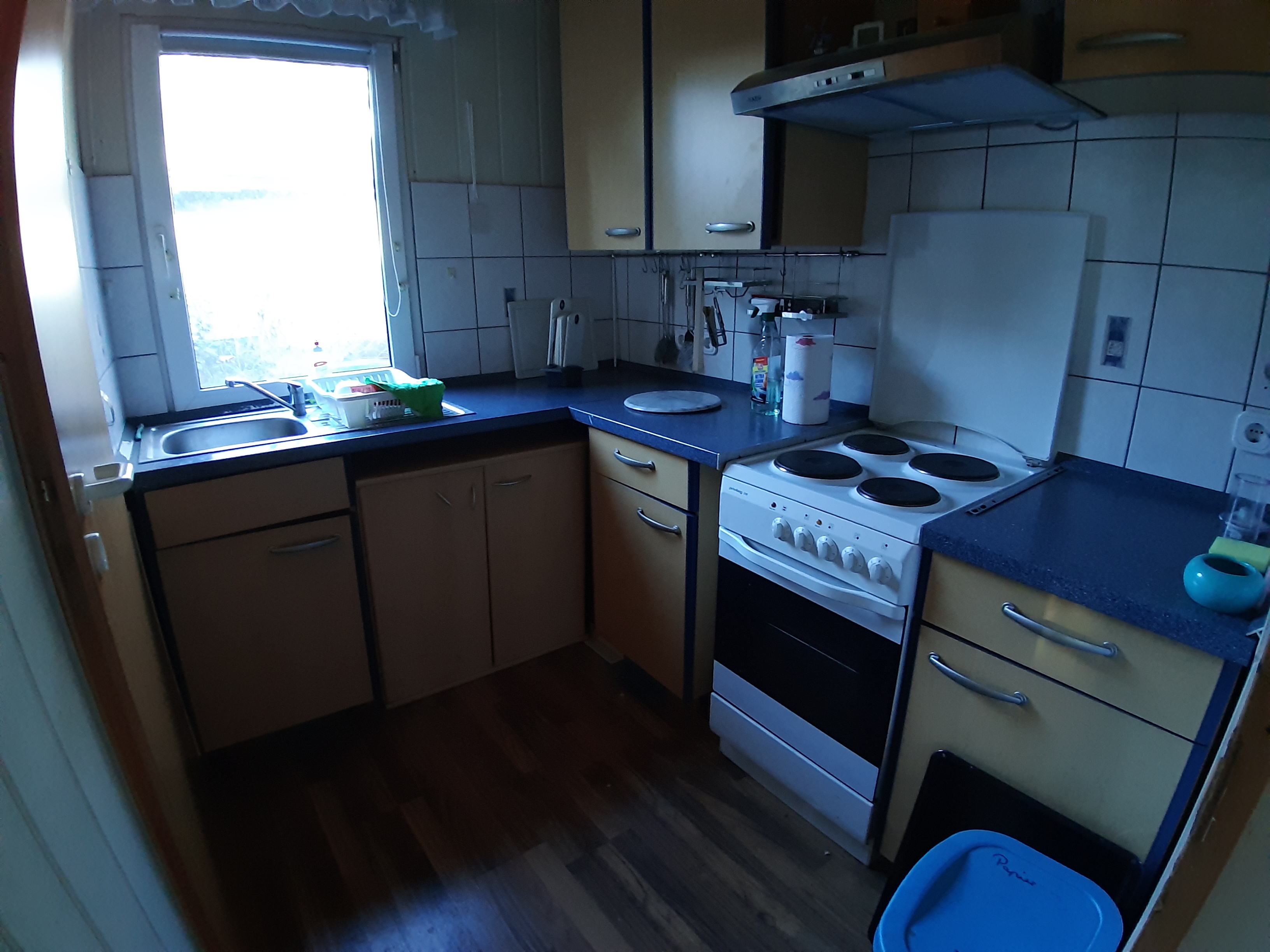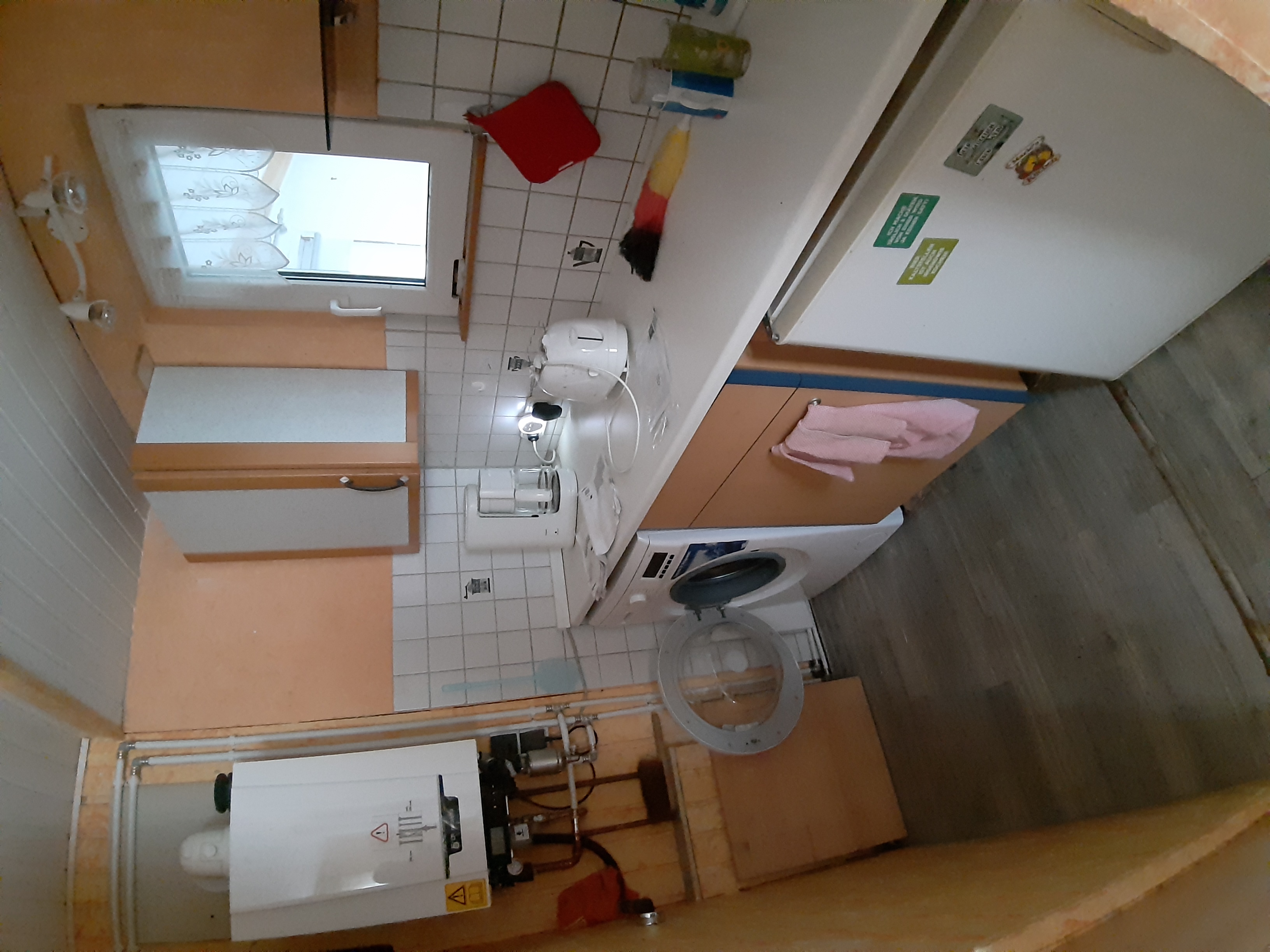 Die Küche ist offen und vom Wohnzimmer aus zu begehen. Ein kleiner Hauswirtschaftsraum dient zur Unterbringung von Trockner und Waschmaschine und einer kleinen Küchenzeile.