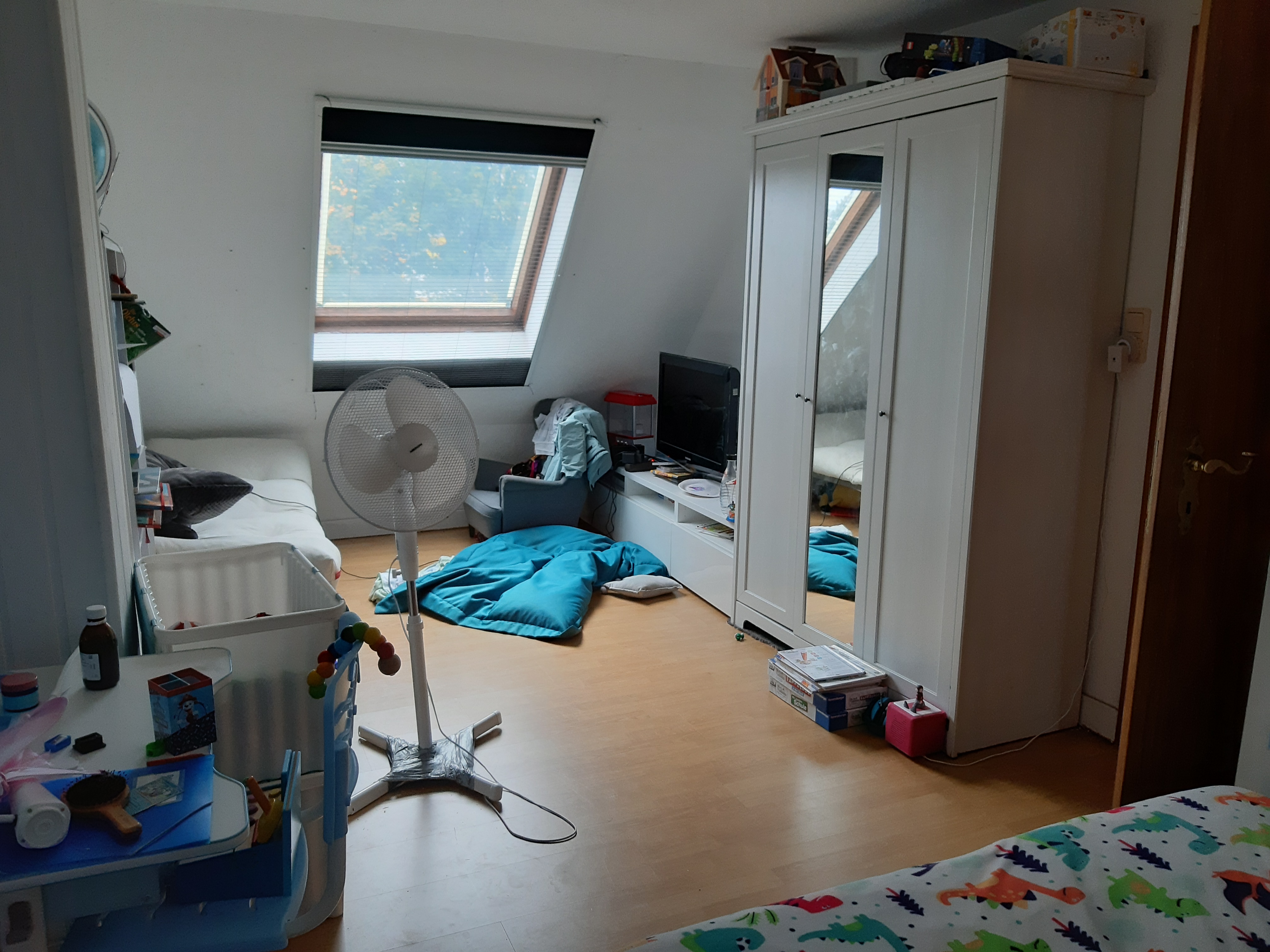 Über eine Holztreppe gelangen Sie in das Obergeschoss. mit 38,17 m² Wohnfläche. Hier befinden sich 2 Schlafzimmer, ein kleines Büro (5,70 m²) sowie ein Duschbad.