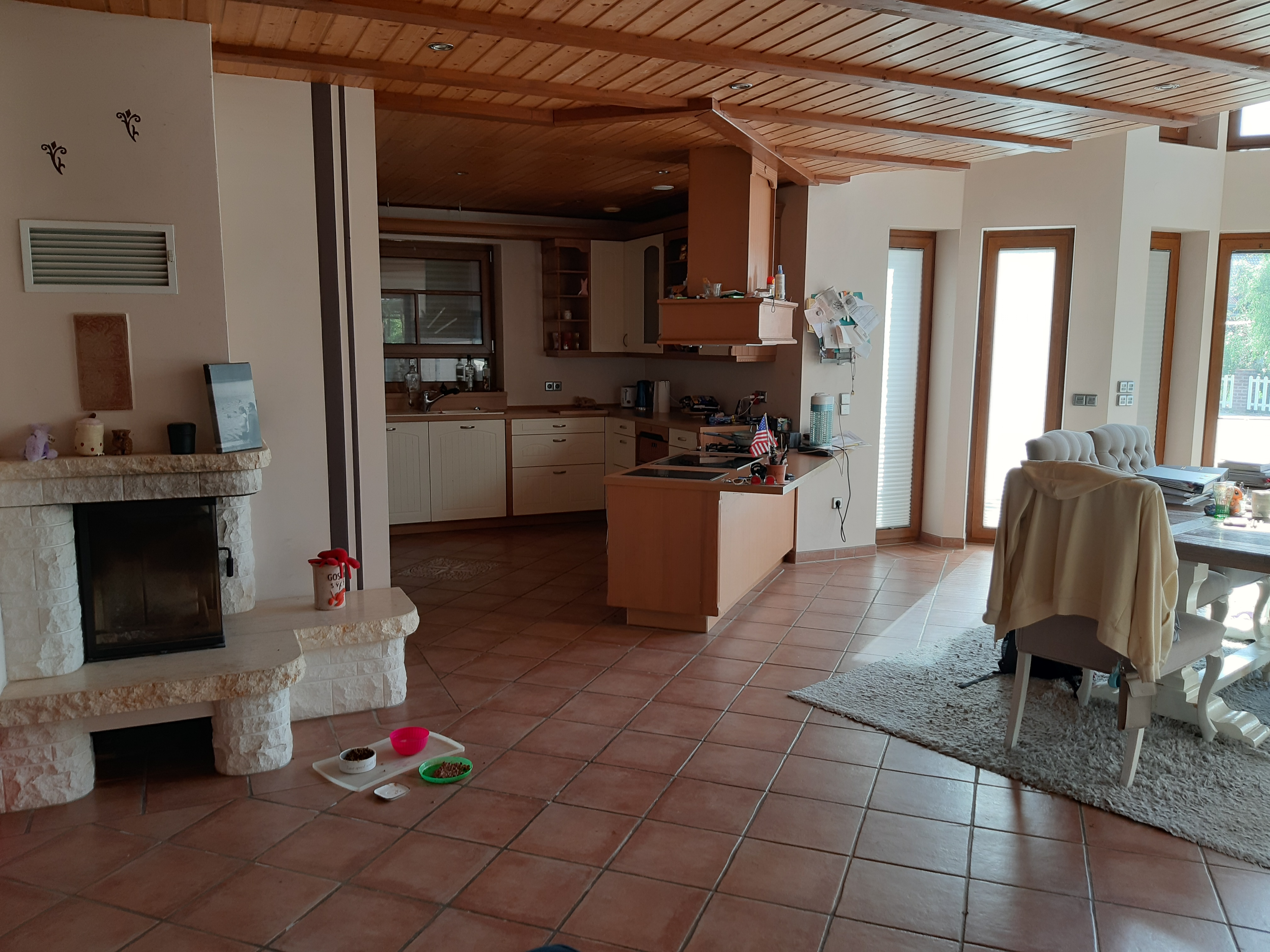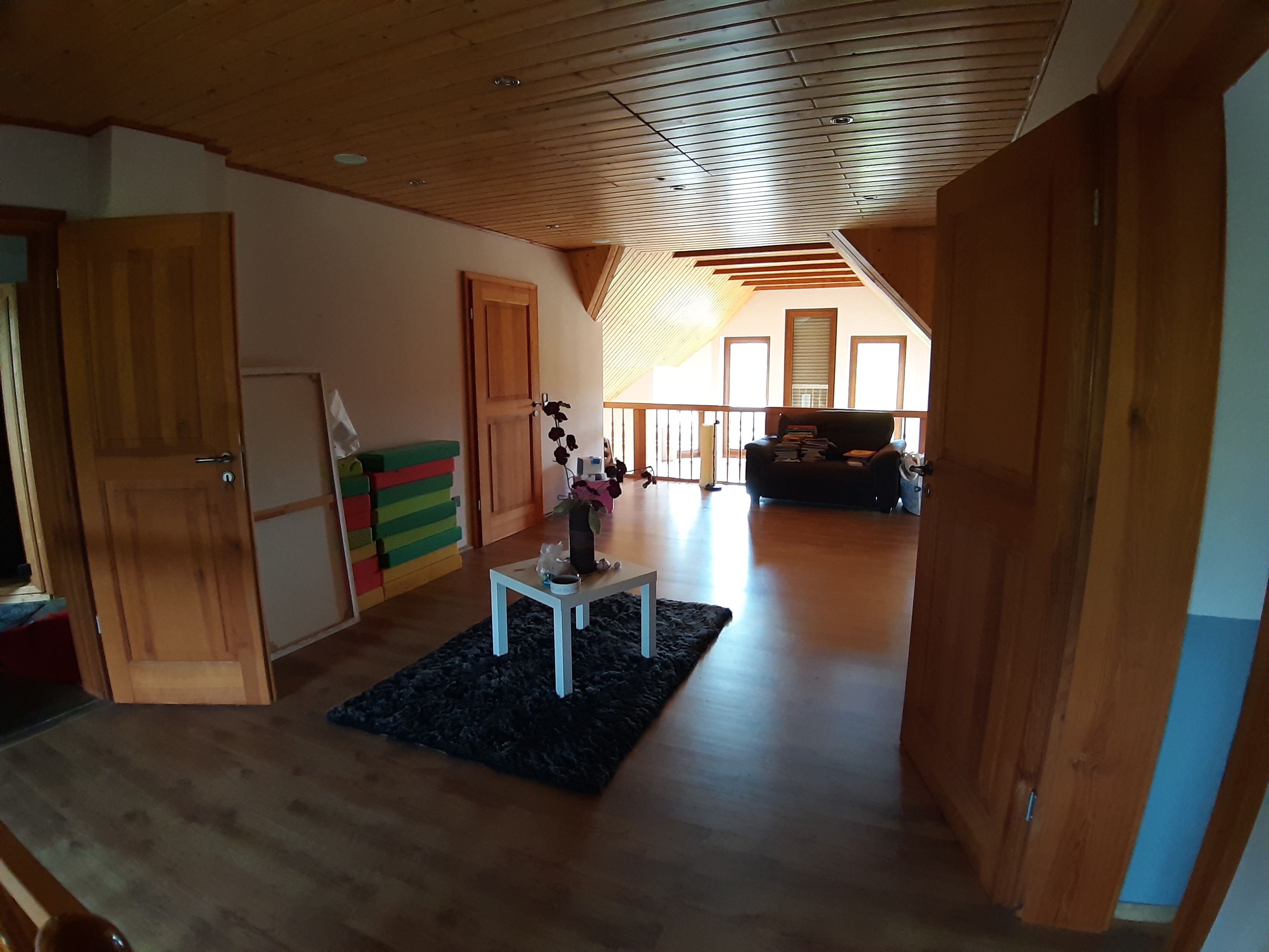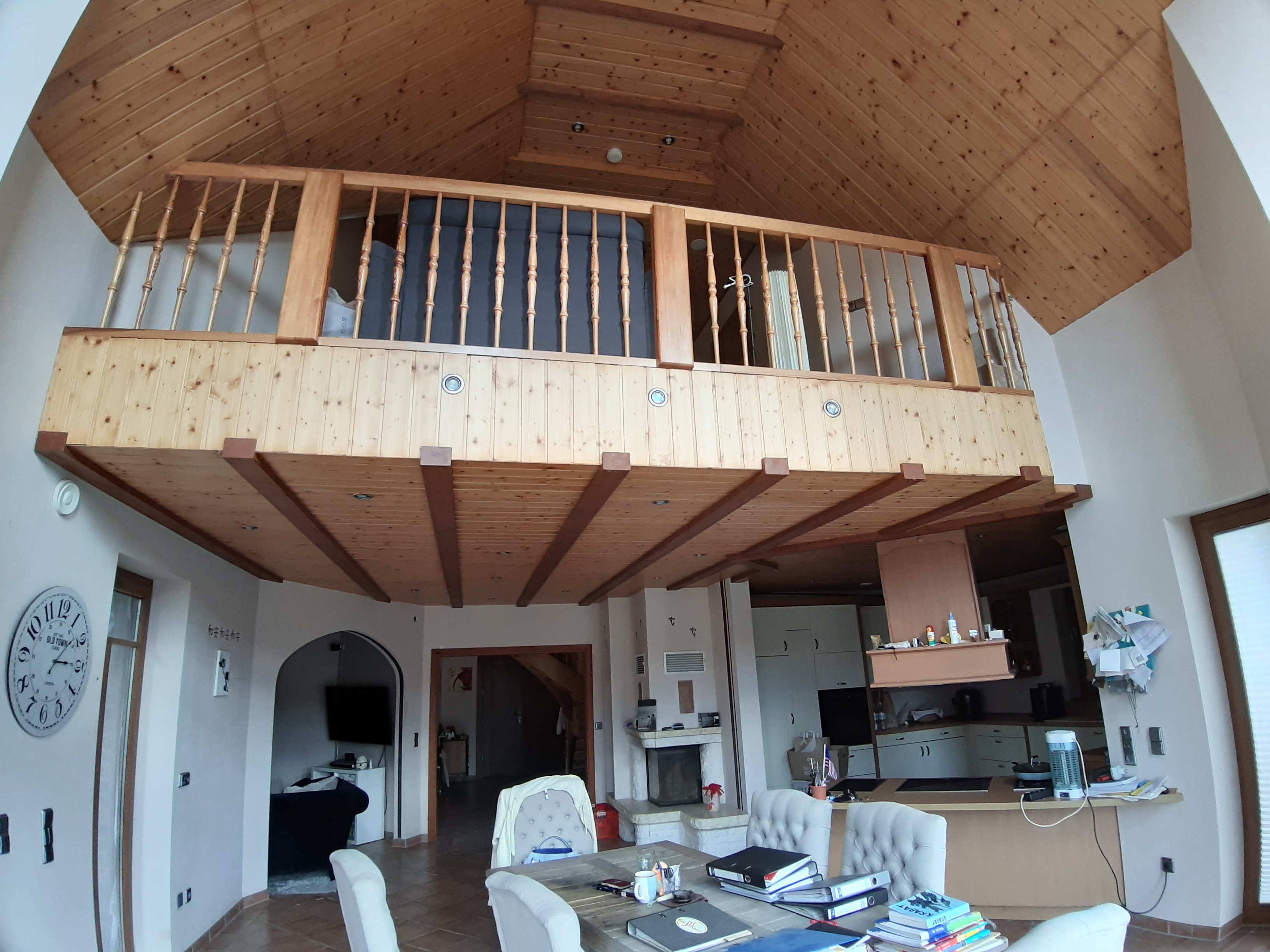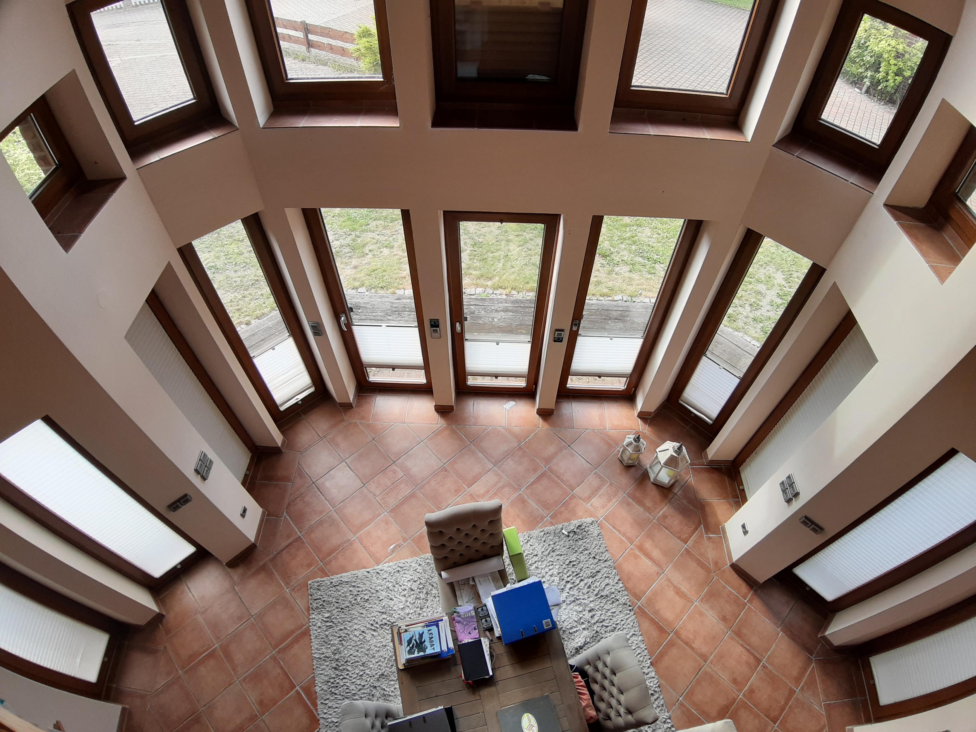 Im Obergeschoss erwartet Sie eine groÃe Galerie, ein Schlafzimmer mit Ankleidezimmer sowie ein Zugang auf den Balkon und einem dazugehörigen Dusch- und Wannenbad. Ein weiteres Zimmer, ein groÃer Partyraum (kann als weiteres Zimmer genutzt werden) sowie eine Sauna mit Dusche und WC komplettierten die obere Etage.