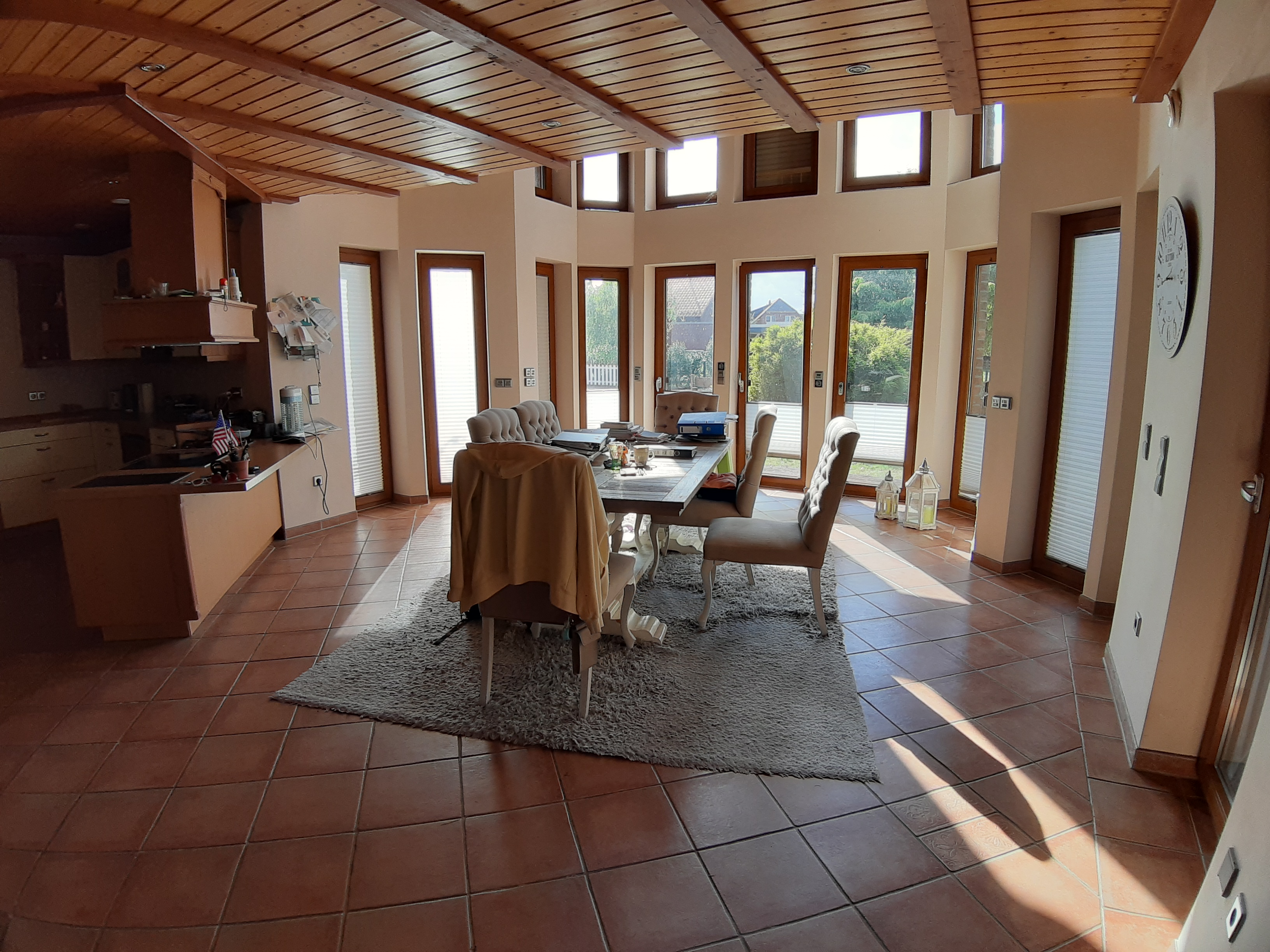 Hier befinden sich der HWR und ein Gäste-WC mit Dusche. Der offen gestaltete Küchen- und Essbereich (kann auch als Wohnbereich genutzt werden) bildet zusammen mit dem derzeit angrenzenden und ebenfalls offenen Kaminzimmer den zentralen Lebensmittelpunkt des Hauses. Ein Kamin im zentralen Mittelpunkt der Räumlichkeiten sorgt für eine gemütliche Atmosphäre.